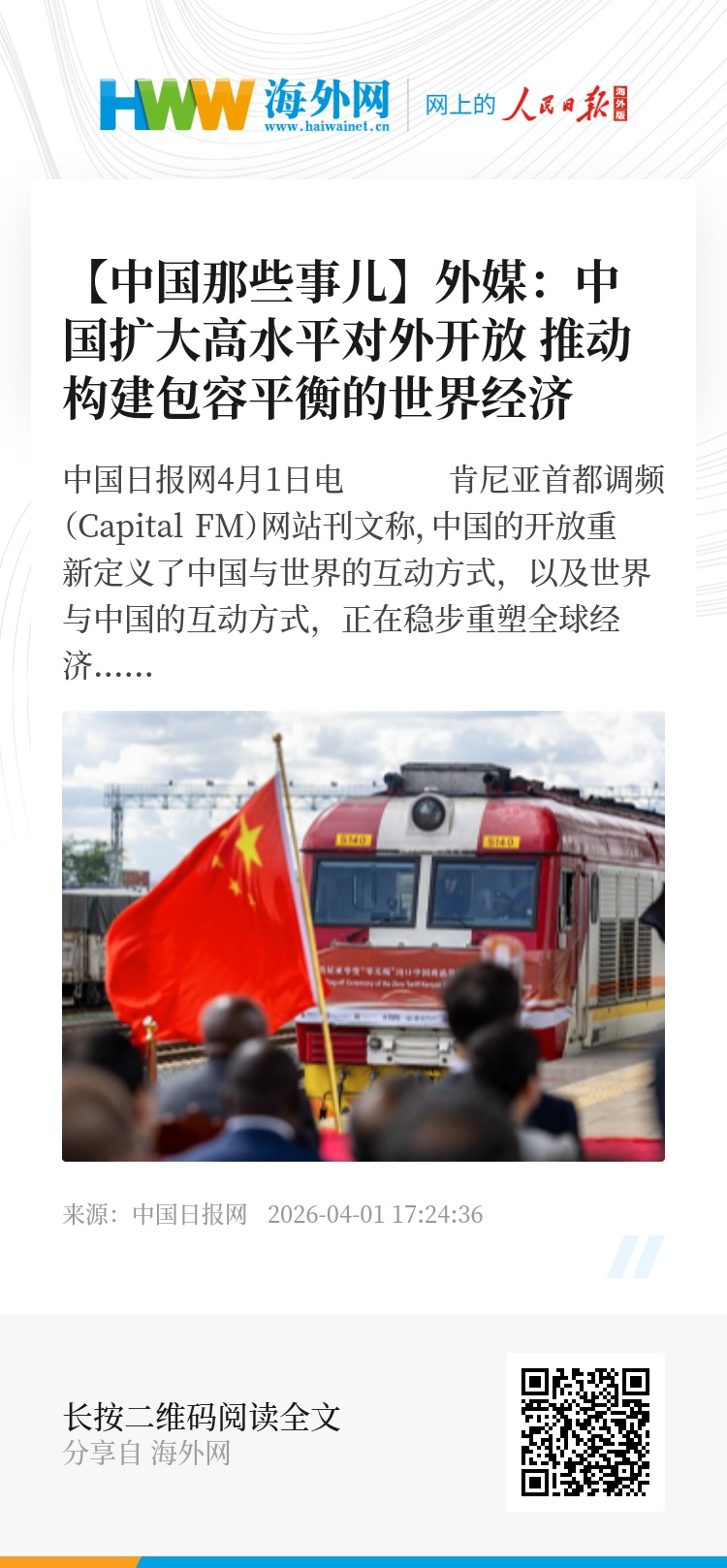 中国日报网4月1日电 肯尼亚首都调频(Capital FM)网站刊文称,中国的开放重新定义了中国与世界的互动方式,以及世界与中国的互动方式,正在稳步重塑全球经济秩序。