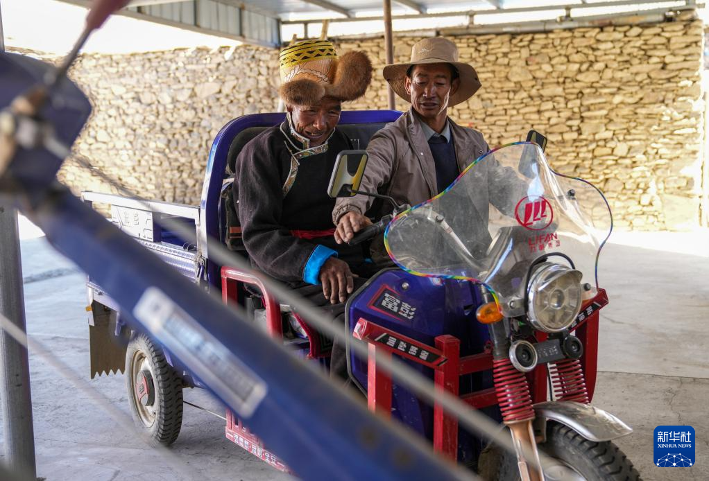 白玛扎西(左)坐在女婿新买的电动三轮摩托车上(3月26日摄)。