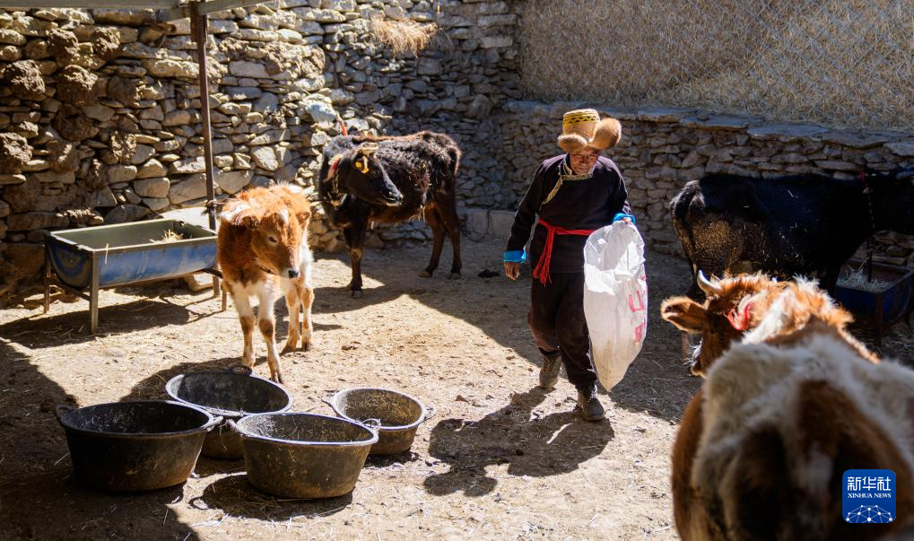 白玛扎西在家中喂牛(3月26日摄)。