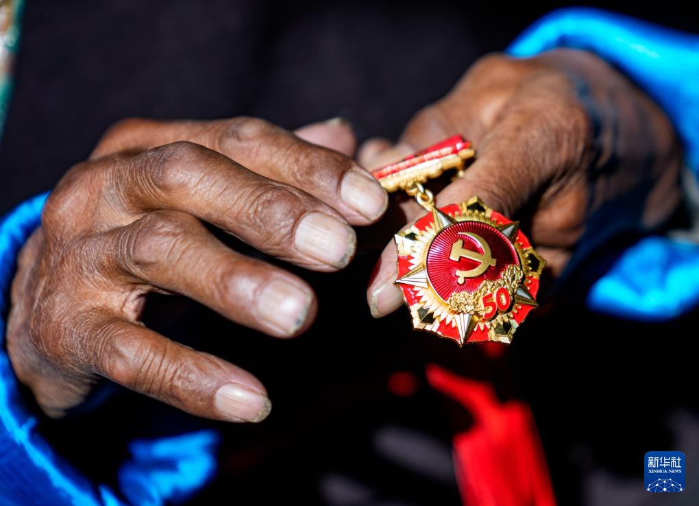 白玛扎西在家中擦拭“光荣在党50年”纪念章(3月26日摄)。