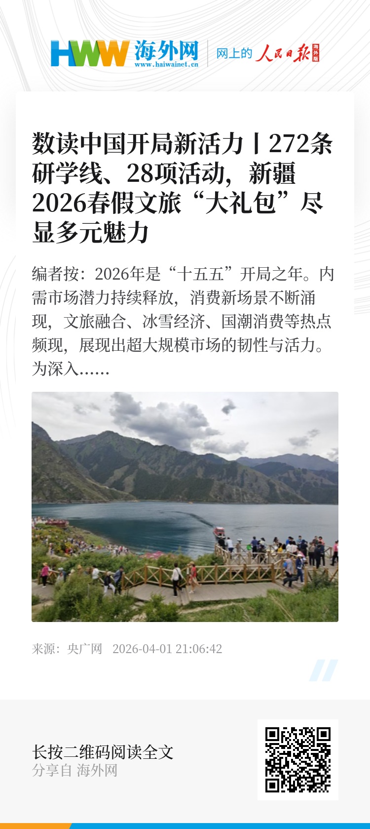 编者按:2026年是“十五五”开局之年。内需市场潜力持续释放,消费新场景不断涌现,文旅融合、冰雪经济、国潮消费等热点频现,展现出超大规模市场的韧性与活力。为深入解读开局新气象,央广网推出《数读中国开局新活力》系列报道,以数据为支撑,聚焦各地消费场景、产业升级与民生改善的生动实践,呈现中国经济稳中求进、活力迸发的时代图景。