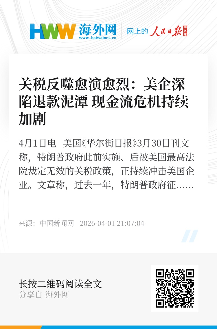 中新网4月1日电 美国《华尔街日报》3月30日刊文称,特朗普政府此前实施、后被美国最高法院裁定无效的关税政策,正持续冲击美国企业。