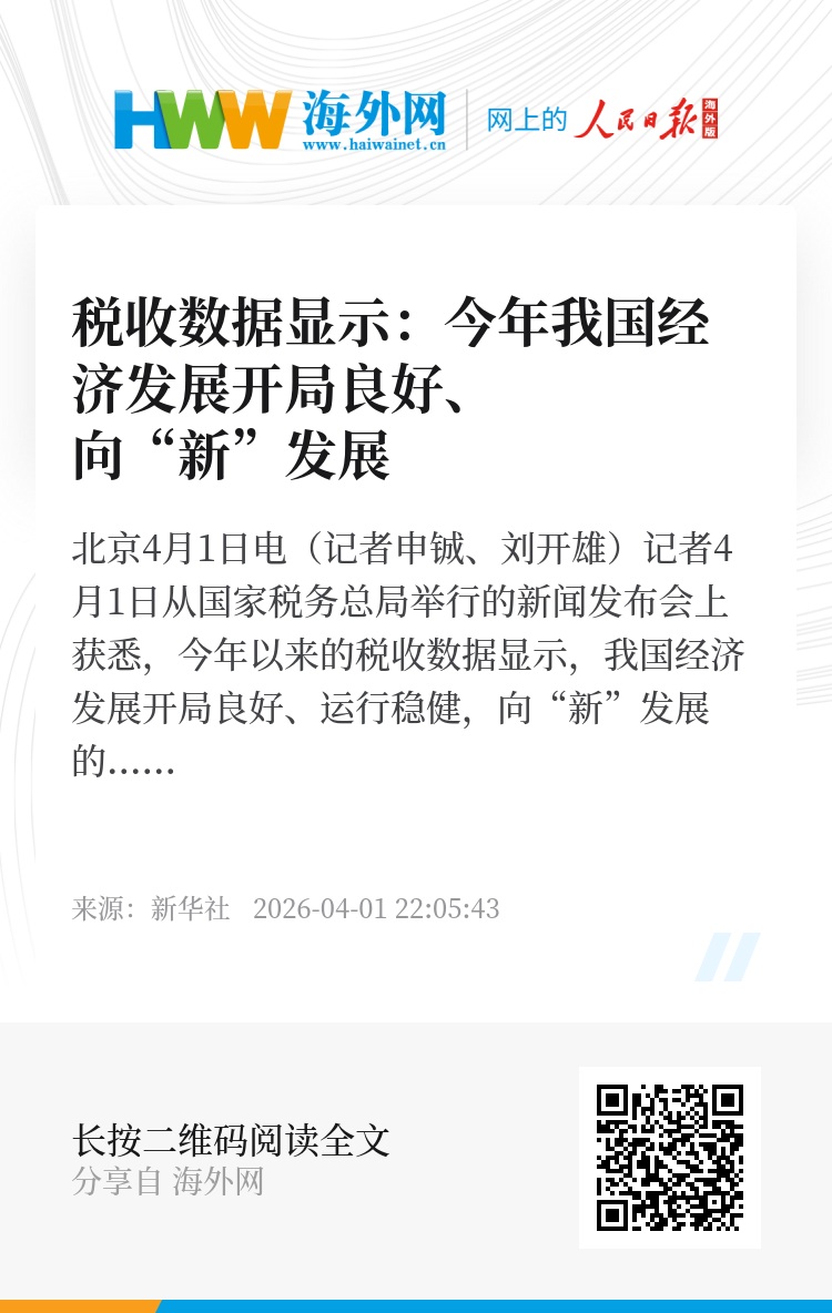 新华社北京4月1日电(记者申铖、刘开雄)记者4月1日从国家税务总局举行的新闻发布会上获悉,今年以来的税收数据显示,我国经济发展开局良好、运行稳健,向“新”发展的脉动愈发强劲。