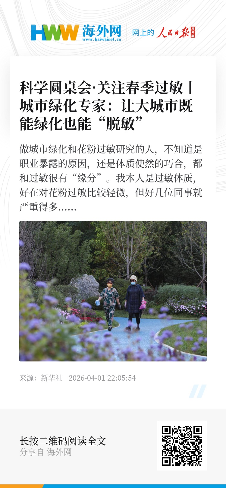 很多城市都提升了森林、湿地等绿色空间的总量,大家也都切身感受到我们的城市越来越绿、越来越美了。但不少人也有疑问:为什么感觉近年来城市的花粉过敏问题越来越严重了?