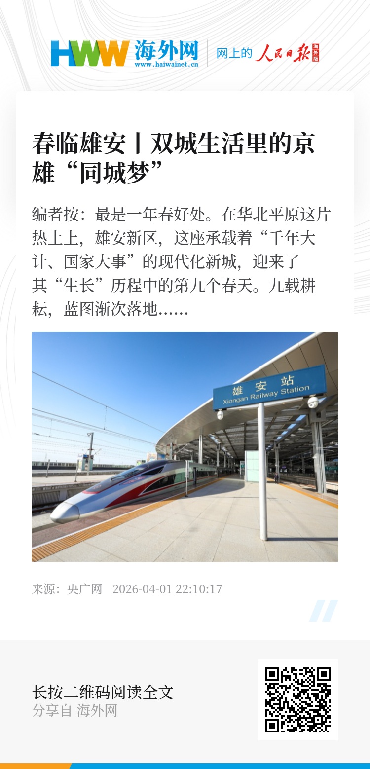 编者按:最是一年春好处。在华北平原这片热土上,雄安新区,这座承载着“千年大计、国家大事”的现代化新城,迎来了其“生长”历程中的第九个春天。九载耕耘,蓝图渐次落地:城市框架全面拉开、项目建设有序推进、承接疏解能力增强、生态环境持续向好、人民生活幸福感不断攀升……值此节点,央广网推出《春临雄安》系列报道,记者深入一线探访,通过春天里的故事讲述雄安新区日新月异的发展脉动,勾勒出这座未来之城从“拔节生长”向“能级跃升”迈进的坚实足迹。