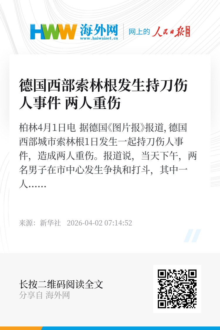 新华社柏林4月1日电 据德国《图片报》报道,德国西部城市索林根1日发生一起持刀伤人事件,造成两人重伤。
