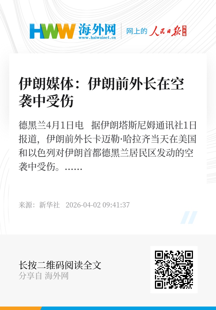 新华社德黑兰4月1日电 据伊朗塔斯尼姆通讯社1日报道,伊朗前外长卡迈勒·哈拉齐当天在美国和以色列对伊朗首都德黑兰居民区发动的空袭中受伤。