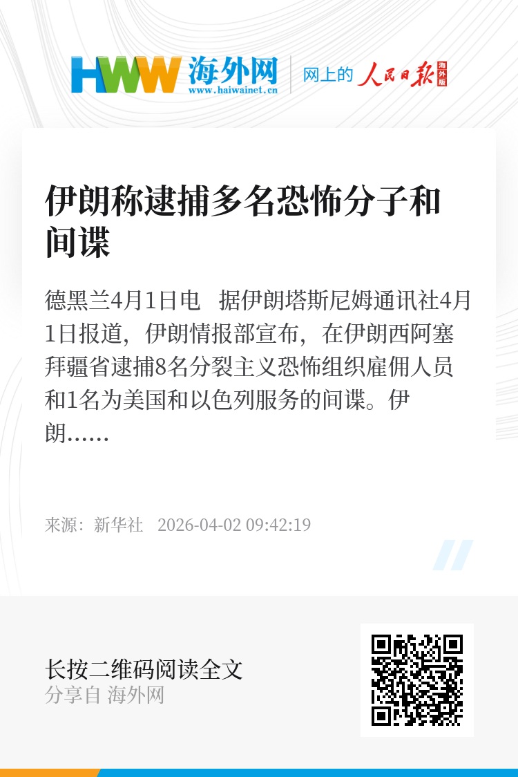 新华社德黑兰4月1日电 据伊朗塔斯尼姆通讯社4月1日报道,伊朗情报部宣布,在伊朗西阿塞拜疆省逮捕8名分裂主义恐怖组织雇佣人员和1名为美国和以色列服务的间谍。
