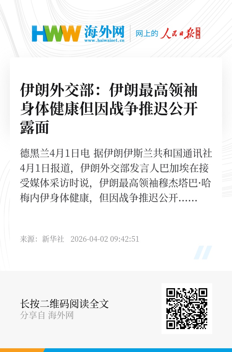 新华社德黑兰4月1日电 据伊朗伊斯兰共和国通讯社4月1日报道,伊朗外交部发言人巴加埃在接受媒体采访时说,伊朗最高领袖穆杰塔巴·哈梅内伊身体健康,但因战争推迟公开露面。