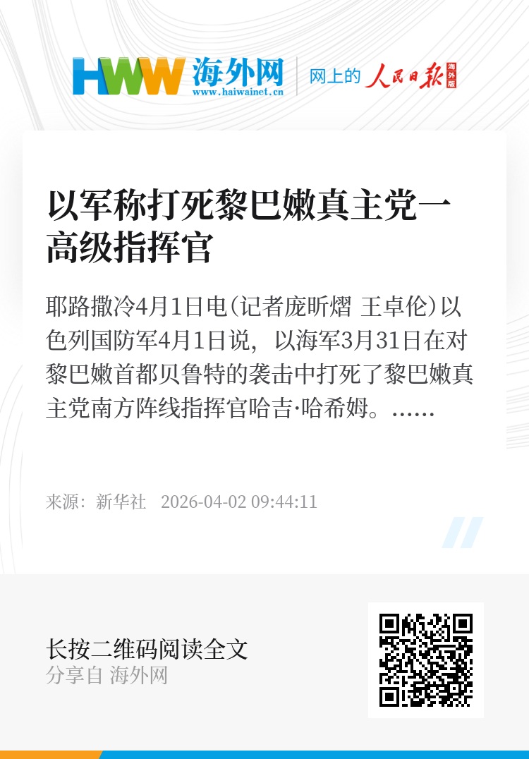 新华社耶路撒冷4月1日电(记者庞昕熠 王卓伦)以色列国防军4月1日说,以海军3月31日在对黎巴嫩首都贝鲁特的袭击中打死了黎巴嫩真主党南方阵线指挥官哈吉·哈希姆。