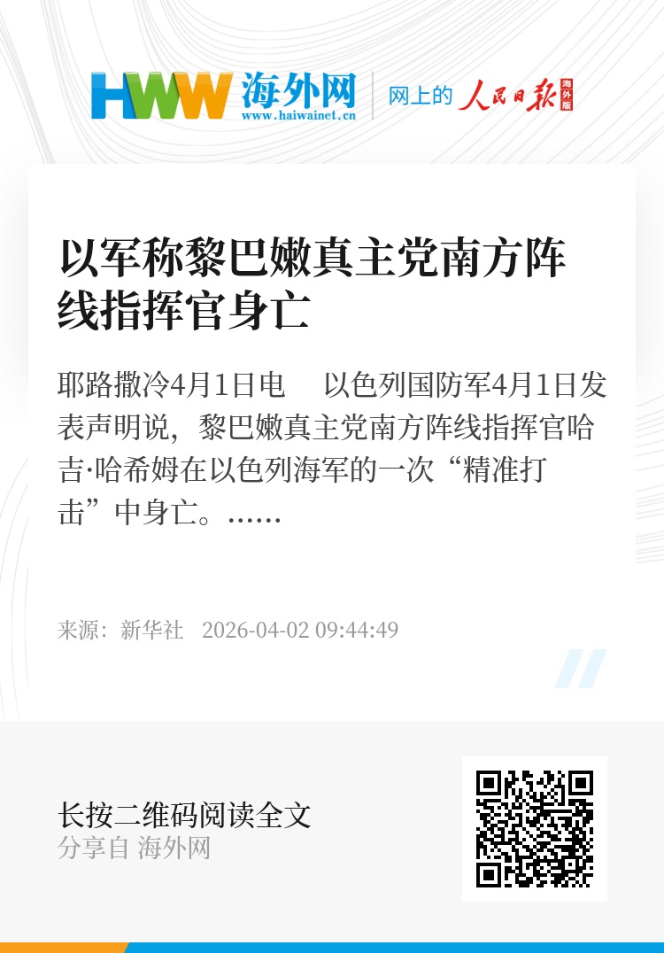 新华社耶路撒冷4月1日电 以色列国防军4月1日发表声明说,黎巴嫩真主党南方阵线指挥官哈吉·哈希姆在以色列海军的一次“精准打击”中身亡。