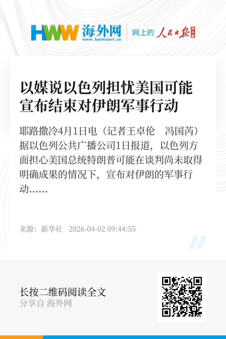 新华社耶路撒冷4月1日电(记者王卓伦 冯国芮)据以色列公共广播公司1日报道,以色列方面担心美国总统特朗普可能在谈判尚未取得明确成果的情况下,宣布对伊朗的军事行动“已取得成果并结束”。