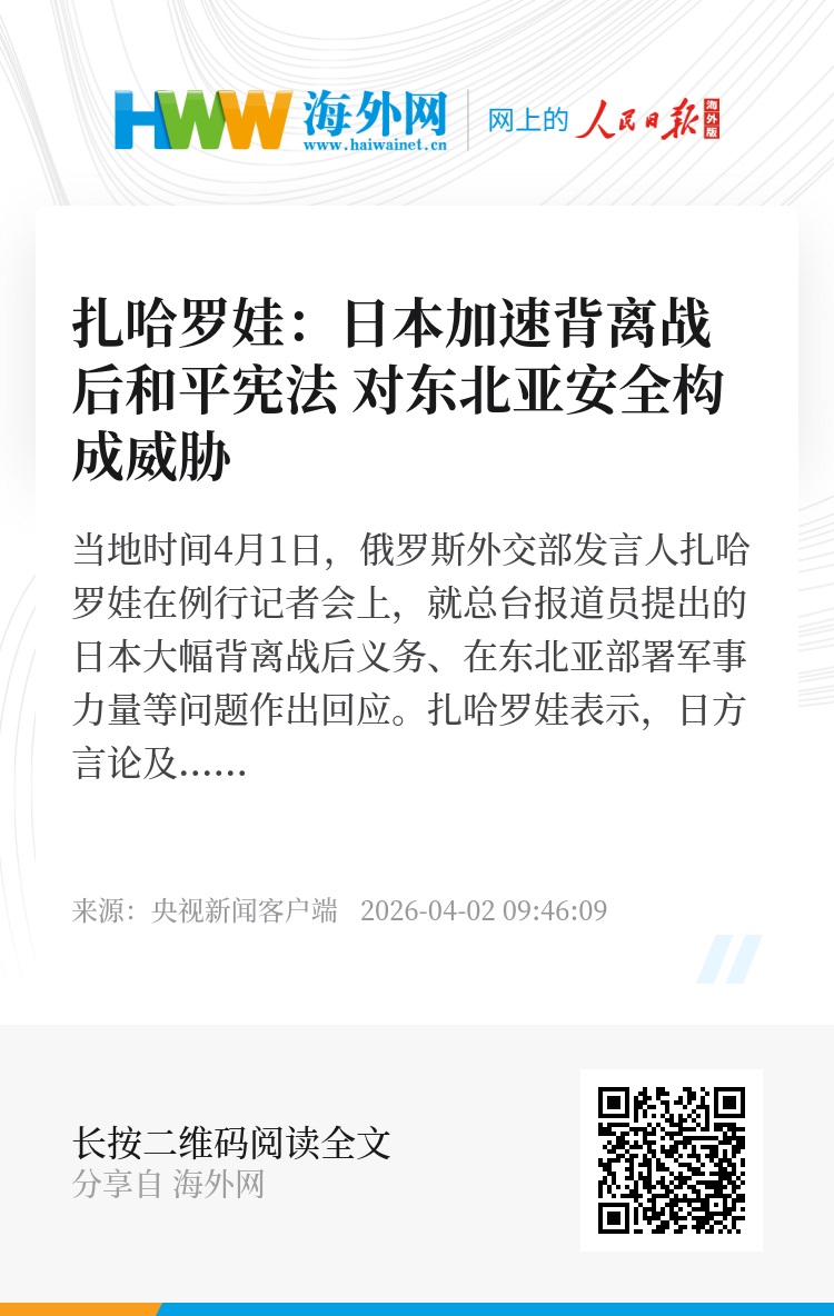 当地时间4月1日,俄罗斯外交部发言人扎哈罗娃在例行记者会上,就总台报道员提出的日本大幅背离战后义务、在东北亚部署军事力量等问题作出回应。