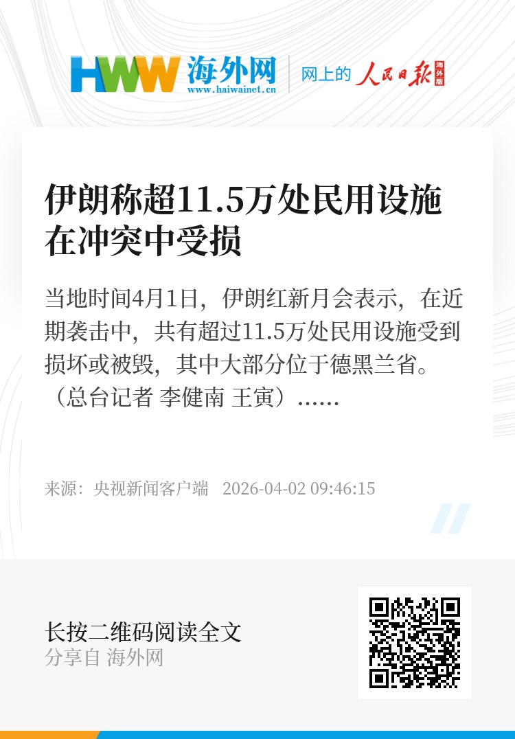 当地时间4月1日,伊朗红新月会表示,在近期袭击中,共有超过11.5万处民用设施受到损坏或被毁,其中大部分位于德黑兰省。(总台记者 李健南 王寅)