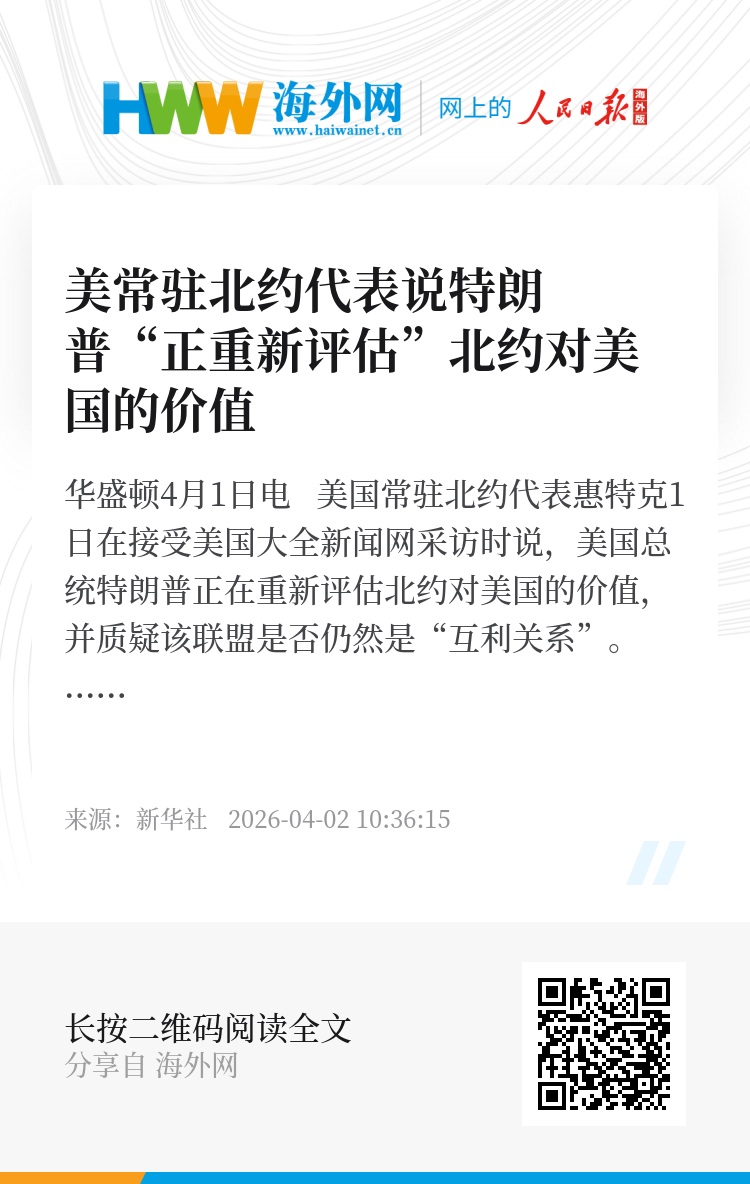 新华社华盛顿4月1日电 美国常驻北约代表惠特克1日在接受美国大全新闻网采访时说,美国总统特朗普正在重新评估北约对美国的价值,并质疑该联盟是否仍然是“互利关系”。