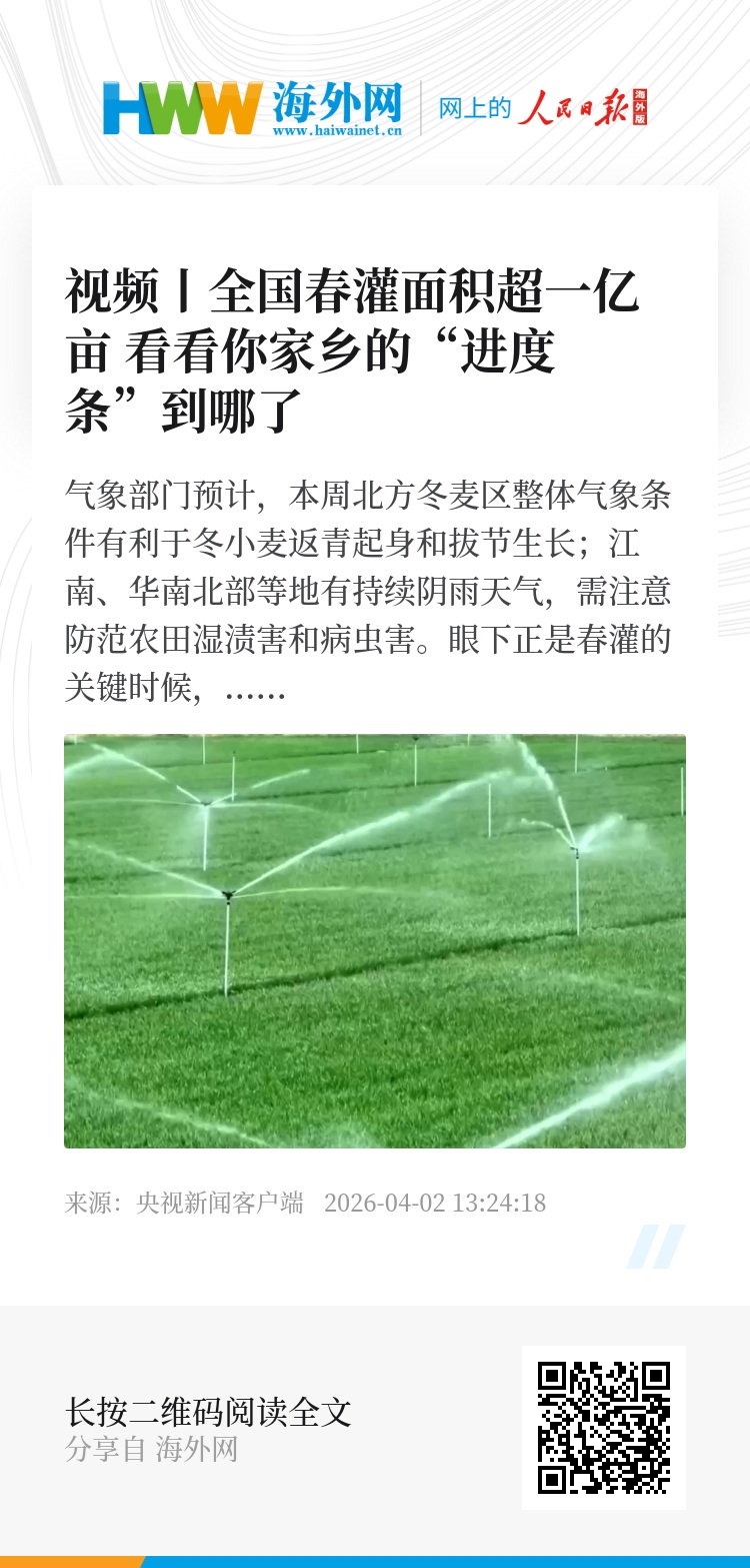 气象部门预计,本周北方冬麦区整体气象条件有利于冬小麦返青起身和拔节生长;江南、华南北部等地有持续阴雨天气,需注意防范农田湿渍害和病虫害。眼下正是春灌的关键时候,水利部最新消息显示,全国已有超过一亿亩农田完成了春灌,各地都在全力保障春灌用水。
