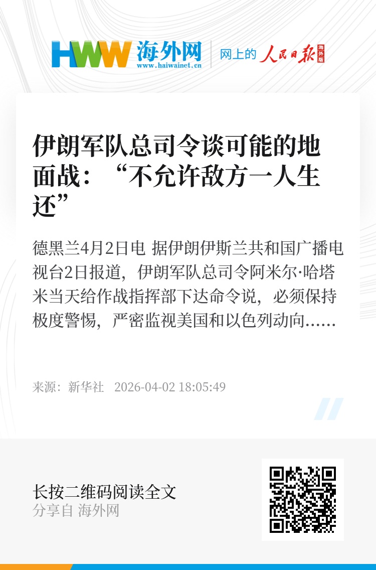 新华社德黑兰4月2日电 据伊朗伊斯兰共和国广播电视台2日报道,伊朗军队总司令阿米尔·哈塔米当天给作战指挥部下达命令说,必须保持极度警惕,严密监视美国和以色列动向,并在适当时机反制敌人。“一旦敌人发动地面战,绝不允许敌方一人生还。”