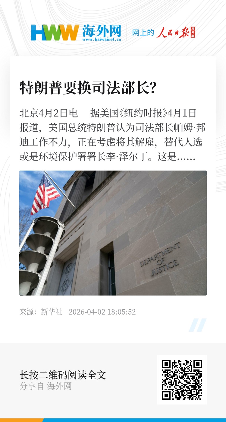 新华社北京4月2日电 据美国《纽约时报》4月1日报道,美国总统特朗普认为司法部长帕姆·邦迪工作不力,正在考虑将其解雇,替代人选或是环境保护署署长李·泽尔丁。
