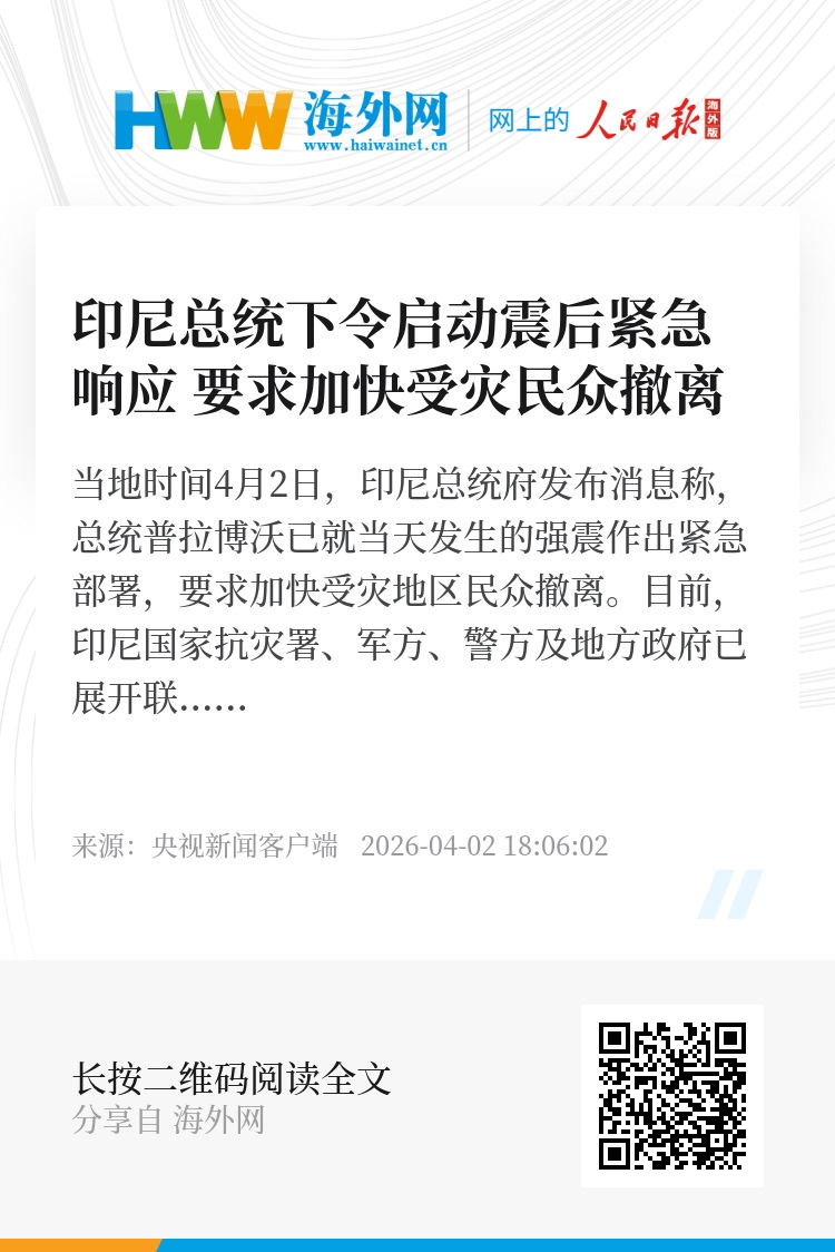 当地时间4月2日,印尼总统府发布消息称,总统普拉博沃已就当天发生的强震作出紧急部署,要求加快受灾地区民众撤离。