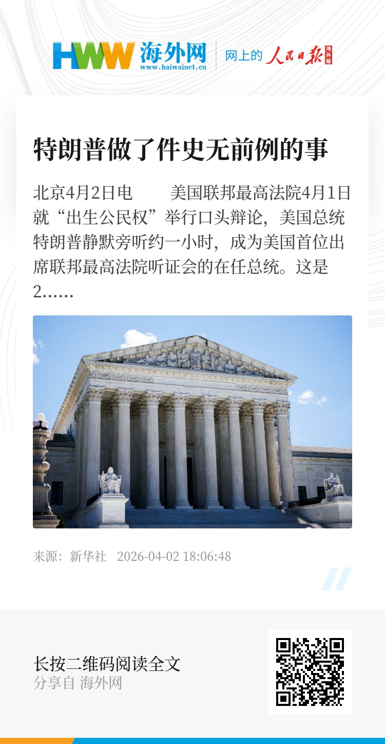 新华社北京4月2日电 美国联邦最高法院4月1日就“出生公民权”举行口头辩论,美国总统特朗普静默旁听约一小时,成为美国首位出席联邦最高法院听证会的在任总统。