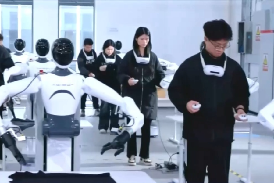 感知的全面升级,来自一墙之隔。100多个真实场景在这里同步训练。搬重物、穿细针、切水果,而且通过大模型,一台机器人学会,所有机器人都能掌握,再迅速实现量产。