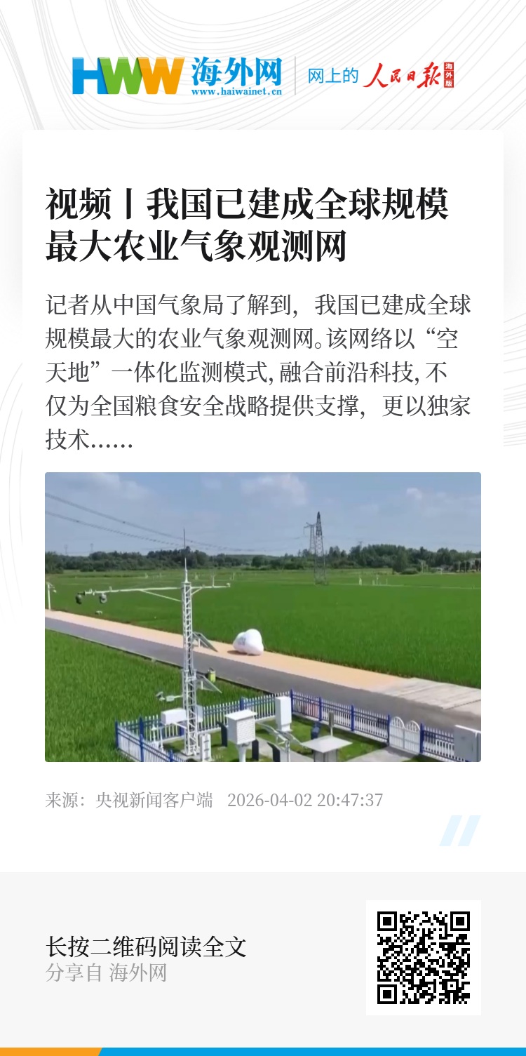 记者从中国气象局了解到,我国已建成全球规模最大的农业气象观测网。该网络以 “空天地” 一体化监测模式,融合前沿科技,不仅为全国粮食安全战略提供支撑,更以独家技术体系成为智慧农业发展的 “数字引擎”。
