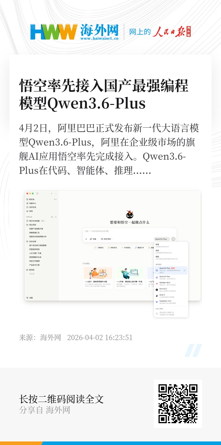 4月2日,阿里巴巴正式发布新一代大语言模型Qwen3.6-Plus,阿里在企业级市场的旗舰AI应用悟空率先完成接入。