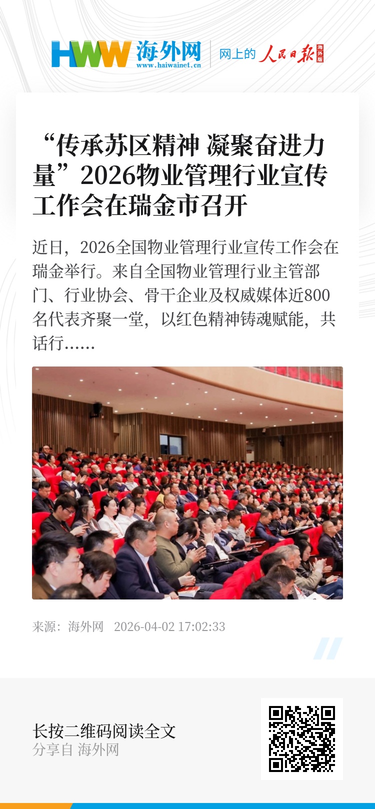 近日,2026全国物业管理行业宣传工作会在瑞金举行。来自全国物业管理行业主管部门、行业协会、骨干企业及权威媒体近800名代表齐聚一堂,以红色精神铸魂赋能,共话行业宣传与高质量发展。