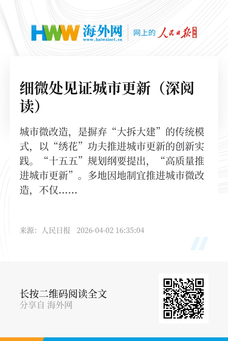 城市微改造,是摒弃“大拆大建”的传统模式,以“绣花”功夫推进城市更新的创新实践。“十五五”规划纲要提出,“高质量推进城市更新”。多地因地制宜推进城市微改造,不仅满足了人民群众对美好生活的期盼,更汇聚起推动城市转型升级、实现高质量发展的深层动能。