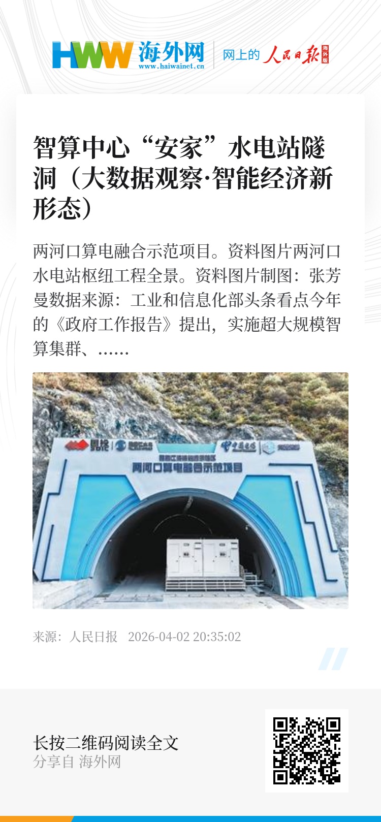 2025年12月,依托两河口水电站,算电融合示范项目在四川省甘孜藏族自治州正式投运。水电站建设时期留下的施工隧洞群“变废为宝”,机房“钻”进水电站“肚中”,探索绿色电力赋能零碳算力。