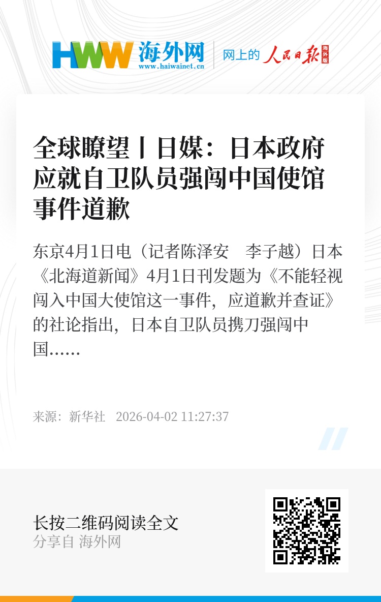 新华社东京4月1日电(记者陈泽安 李子越)日本《北海道新闻》4月1日刊发题为《不能轻视闯入中国大使馆这一事件,应道歉并查证》的社论指出,日本自卫队员携刀强闯中国大使馆是严重事件,日本政府应明确道歉并详细调查原委。文章摘要如下: