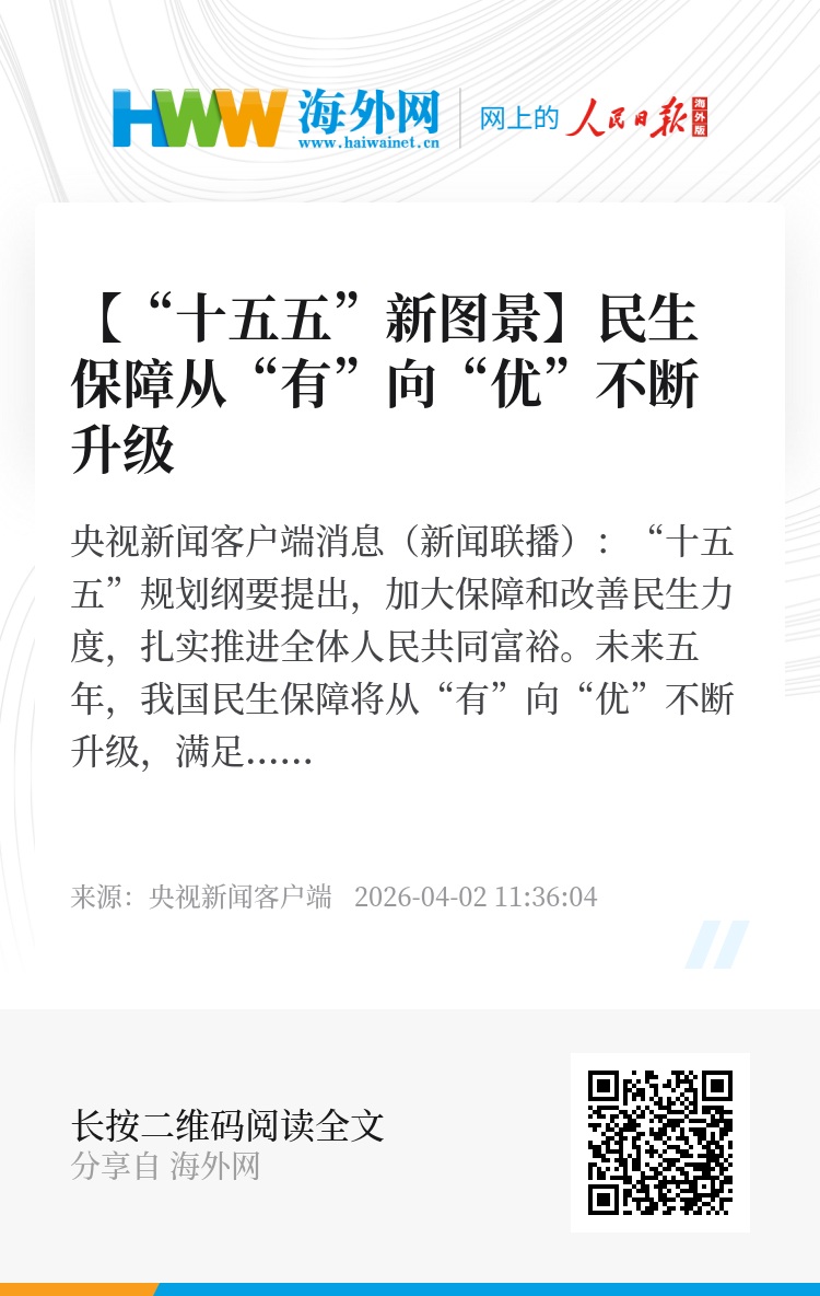 央视新闻客户端消息(新闻联播):“十五五”规划纲要提出,加大保障和改善民生力度,扎实推进全体人民共同富裕。未来五年,我国民生保障将从“有”向“优”不断升级,满足人民对美好生活的向往。