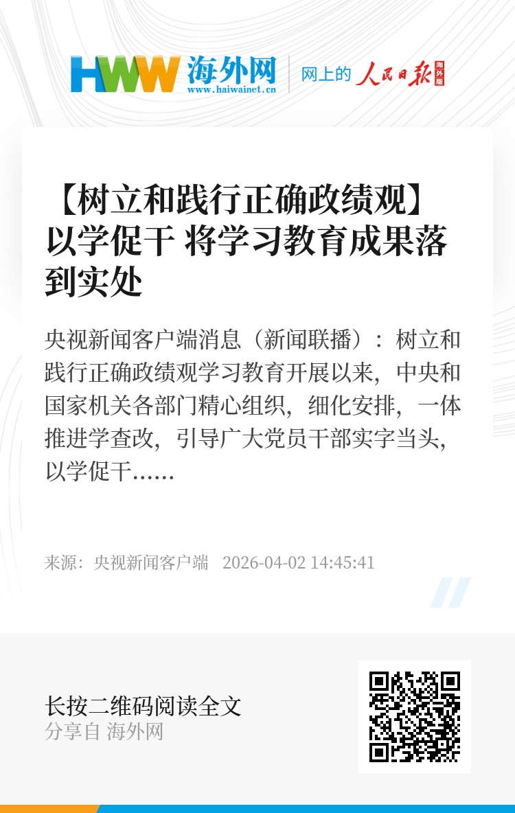 央视新闻客户端消息(新闻联播):树立和践行正确政绩观学习教育开展以来,中央和国家机关各部门精心组织,细化安排,一体推进学查改,引导广大党员干部实字当头,以学促干,将学习教育成果落到实处。