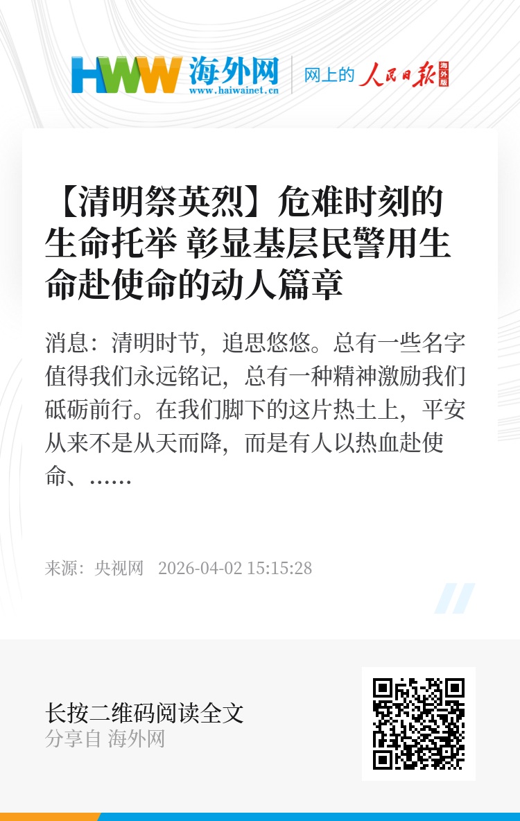 央视网消息:清明时节,追思悠悠。总有一些名字值得我们永远铭记,总有一种精神激励我们砥砺前行。在我们脚下的这片热土上,平安从来不是从天而降,而是有人以热血赴使命、以生命护苍生。杨国林是宁夏回族自治区同心县公安局预旺派出所四级警长。2025年10月31日,杨国林在处置一起油罐车清洗救援警情时,为抢救群众生命财产安全,他挺身而出、英勇牺牲,年仅34岁。