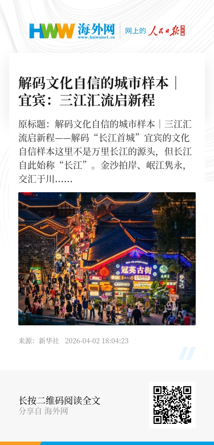 从滇南馆里的川滇旧影,到“长发升”酒坊里数百年不断的酒香;从打造僰道历史文化旅游休闲街区、长江文化主题公园,到建设四川南向开放枢纽门户、国际旅游城市——宜宾依江而兴、以包容为怀,始终以天下人为宾,让长江文脉在新时代生生不息。