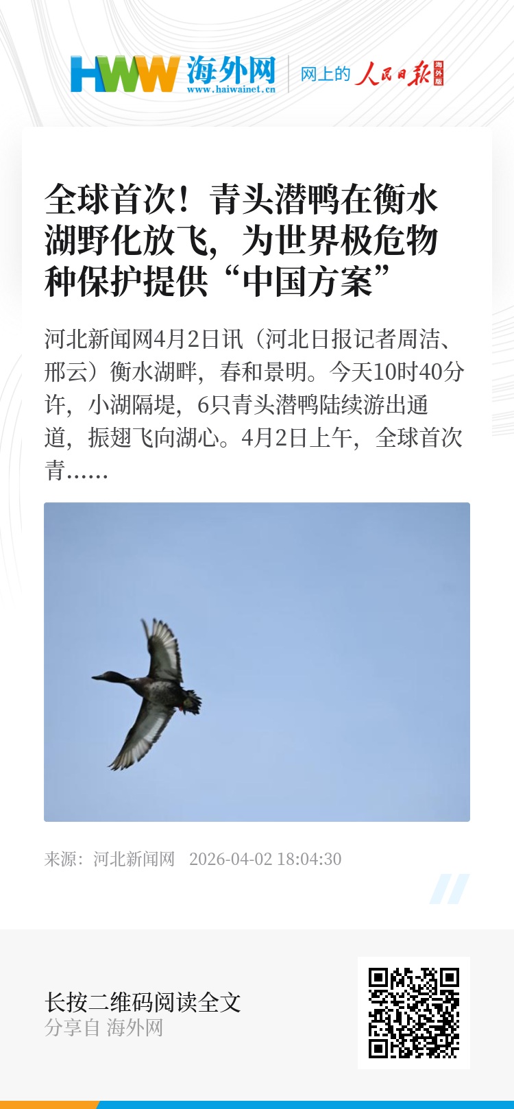 “十年艰难探索,我们从科研创新到保护实践,为全球青头潜鸭保护提供了‘中国方案’。”丁长青表示。2025年,全国青头潜鸭越冬同步调查数据显示,我国种群数量达2555只,与2012年的1000只相比实现倍增。