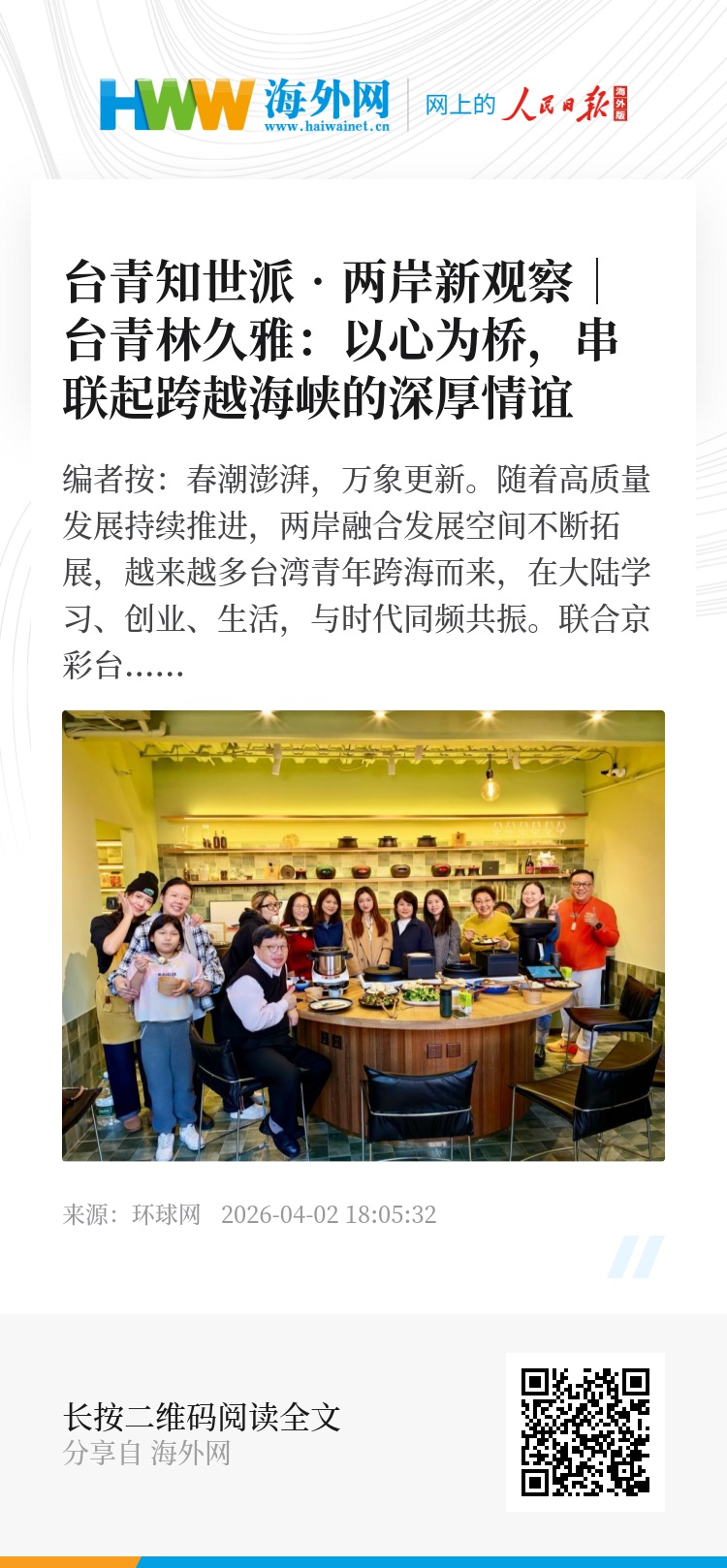 编者按:春潮澎湃,万象更新。随着高质量发展持续推进,两岸融合发展空间不断拓展,越来越多台湾青年跨海而来,在大陆学习、创业、生活,与时代同频共振。环球网联合京彩台湾推出“台青知世派•两岸新观察”系列报道,聚焦活跃在不同领域的台湾青年,记录他们如何践行两会释放的发展信号,如何在日新月异的祖国大陆找到人生舞台,书写个人成长与拉近两岸青年交流的动人篇章。