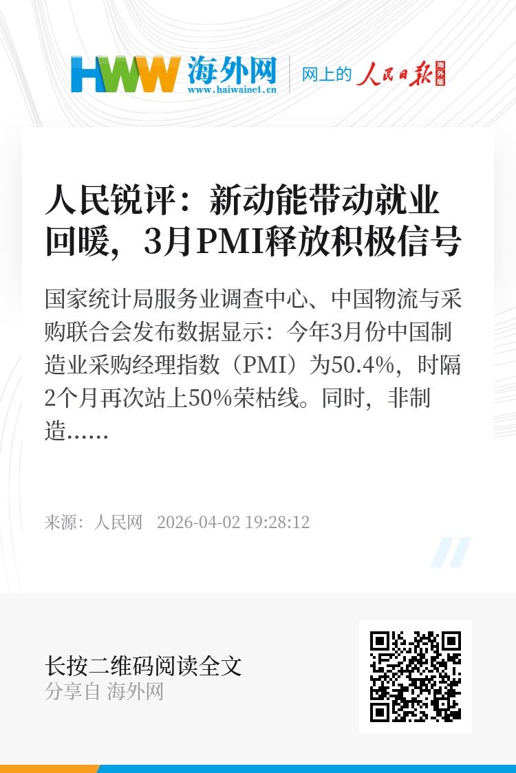 2026年经济开了个好头,不仅体现在总量扩张上,更体现在结构优化上。高技术制造业PMI持续领跑,专用设备、汽车、铁路船舶航空航天设备等行业生产经营活动预期指数,位于56.0%以上较高景气区间,经济结构优化的态势得到有力印证。“十五五”开局之年的中国经济,不仅有传统动能托底,更有新动能接力,为全年实现质的有效提升和量的合理增长打下了坚实基础。