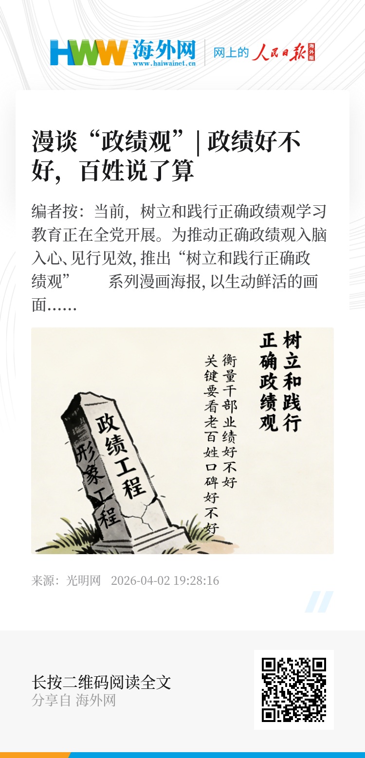 当前,树立和践行正确政绩观学习教育正在全党开展。为推动正确政绩观入脑入心、见行见效,光明网推出 “树立和践行正确政绩观” 系列漫画海报,以生动鲜活的画面、通俗易懂的表达,从不同维度阐释正确政绩观的核心要义。
