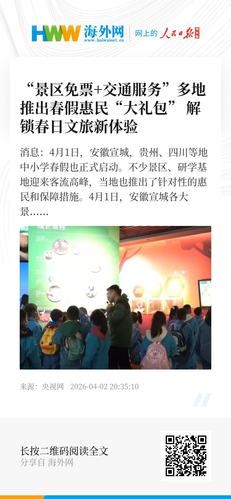 央视网消息:4月1日,安徽宣城,贵州、四川等地中小学春假也正式启动。不少景区、研学基地迎来客流高峰,当地也推出了针对性的惠民和保障措施。