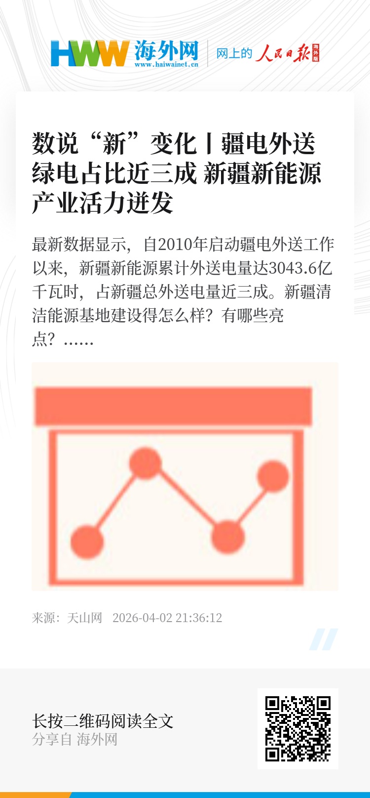 最新数据显示,自2010年启动疆电外送工作以来,新疆新能源累计外送电量达3043.6亿千瓦时,占新疆总外送电量近三成。新疆清洁能源基地建设得怎么样?有哪些亮点?今天的《数说“新”变化》一起来看看。