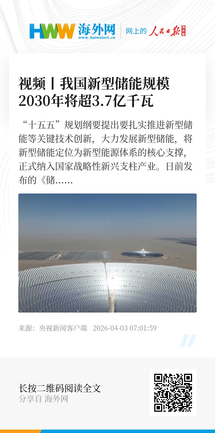 日前发布的《储能产业研究白皮书2026》显示,到2030年我国新型储能累计装机将超过3.7亿千瓦,较“十四五”末增长1.5倍以上。