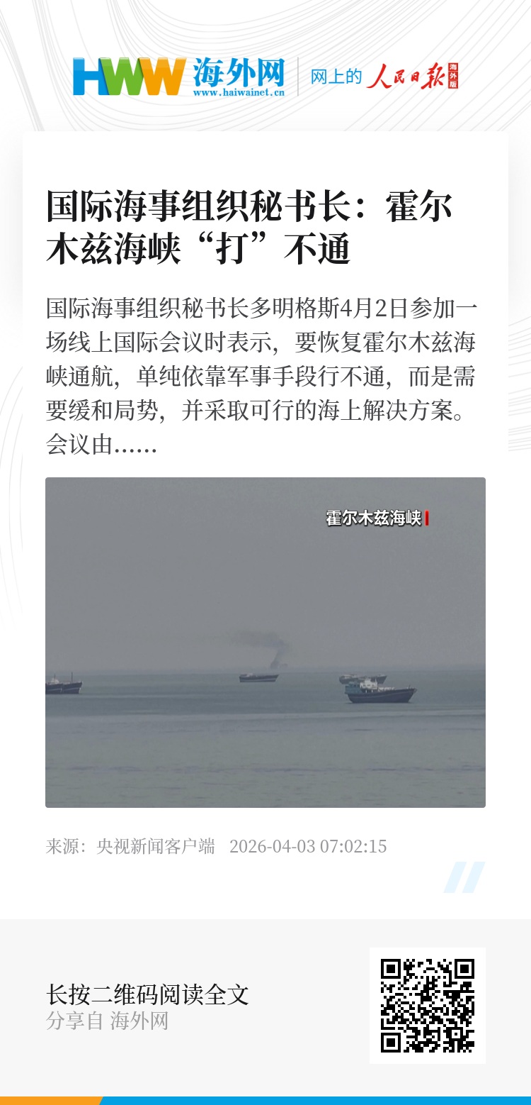 国际海事组织秘书长多明格斯4月2日参加一场线上国际会议时表示,要恢复霍尔木兹海峡通航,单纯依靠军事手段行不通,而是需要缓和局势,并采取可行的海上解决方案。