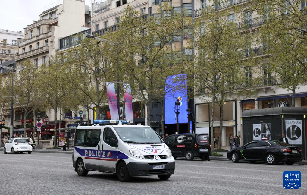 4月2日,在法国巴黎,警车行驶在法国巴黎香榭丽舍大街。新华社记者 邬惠我 摄