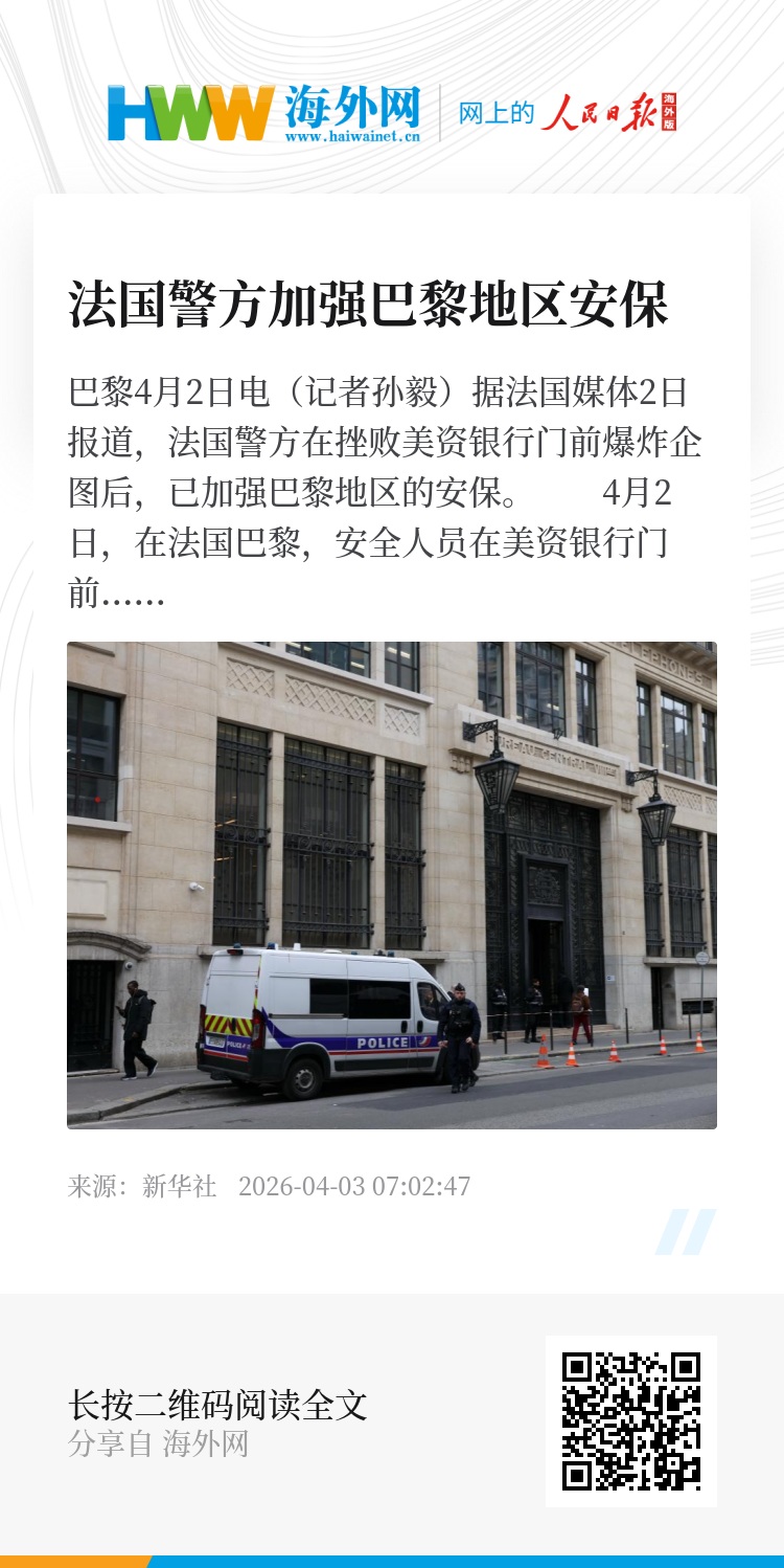 新华社巴黎4月2日电(记者孙毅)据法国媒体2日报道,法国警方在挫败美资银行门前爆炸企图后,已加强巴黎地区的安保。