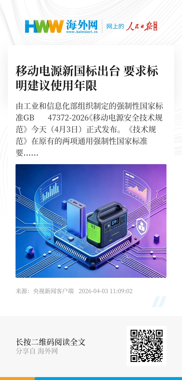 由工业和信息化部组织制定的强制性国家标准GB 47372-2026《移动电源安全技术规范》今天(4月3日)正式发布。《技术规范》在原有的两项通用强制性国家标准要求的基础上明确了多项关键要求。