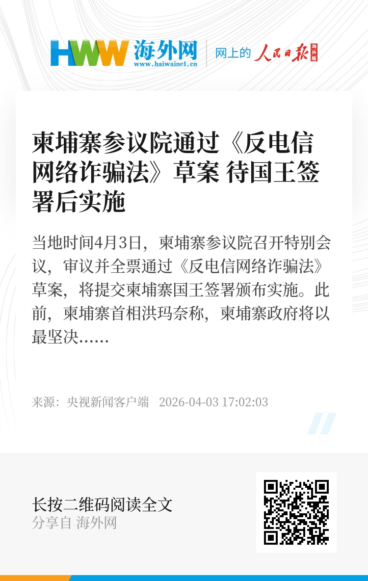 当地时间4月3日,柬埔寨参议院召开特别会议,审议并全票通过《反电信网络诈骗法》草案,将提交柬埔寨国王签署颁布实施。