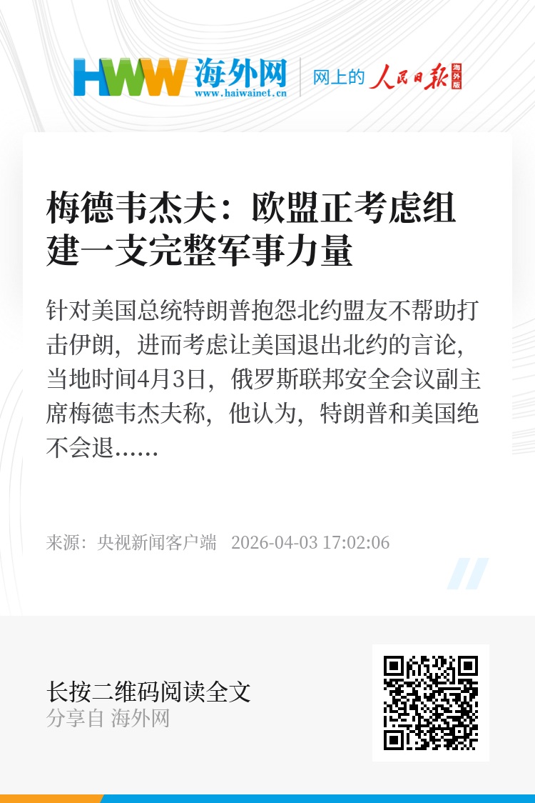 梅德韦杰夫表示,真正值得警惕的是,北约内部矛盾因伊朗战事加剧,欧洲政客正认真考虑在欧盟内部建立一支完整的军事力量。他表示,欧盟已不再是一个经济联盟,它可能很快转变为极端敌视俄罗斯的军事联盟,“在某些方面甚至比北约更糟糕”。
