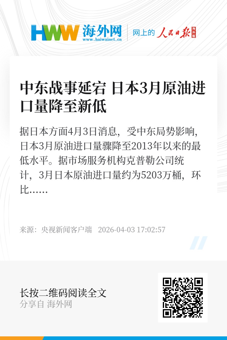据日本方面4月3日消息,受中东局势影响,日本3月原油进口量骤降至2013年以来的最低水平。