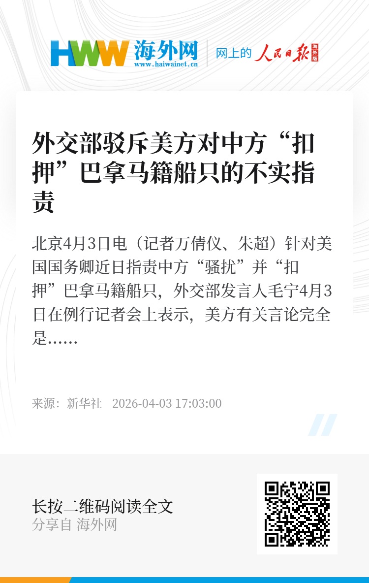 新华社北京4月3日电(记者万倩仪、朱超)针对美国国务卿近日指责中方“骚扰”并“扣押”巴拿马籍船只,外交部发言人毛宁4月3日在例行记者会上表示,美方有关言论完全是无中生有、颠倒黑白。美方一再说三道四,只能暴露自身霸占运河的图谋。究竟是谁公然通过单边霸凌和胁迫破坏巴拿马运河的中立地位,破坏全球供应链的稳定?公道自在人心。中方在巴拿马有关港口问题上的立场是明确的,将坚定维护自身的正当权益。